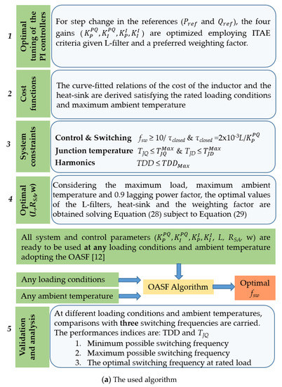 An online adaptive switching frequency (OASF) algorithm that considers the power quality of the output current and the efficiency of the VSI as a combined objective function is presented recently in [12]. Due to its simplicity and online capability, the variable algorithm in [12] is adopted in this study. The employed OASF depends on the weighting factor to achieve a trade-off between the power quality of the output current and the efficiency of the VSI. The selection of the weighting factor and the overall system optimization design have not been covered or discussed in [12]. A new degree of freedom is added to the employed OASF algorithm for the optimal selection of the weighting factor and the overall system optimization design.