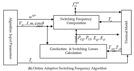 Figure 3 shows a summary of the proposed work, in which the proposed algorithm is shown in Figure 3a, while the OASF implementation in the FPGA is shown in Figure 3b. The case temperature is sensed and used as input to the thermal model to estimate , , and . The loading condition and both and can be used to estimate the conduction and the energy switching losses based on the behavioral model. Thus, the optimal switching frequency can be readily calculated given the optimal weighting factor .