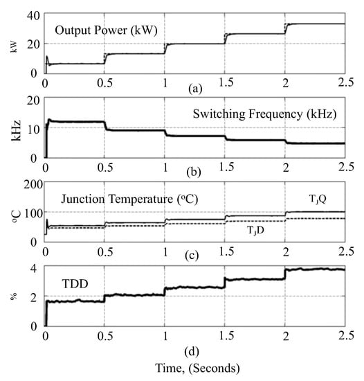 Effect of the load change on the switching frequency, junction temperatures, and TDD, (a) the output power in kW; (b) the switching frequency in kHz; (c) the IGBT and diode junction temperatures in °C; (d) the TDD of the output current.