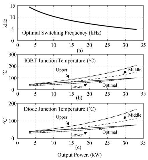 Changing the switching frequency without monitoring the junction temperature may lead to power module failure. As the conduction losses can be estimated, the maximum possible switching losses are limited to the difference between the maximum power losses and the conduction loss as seen in Equations (26) and (27) for the diode and the IGBT, respectively