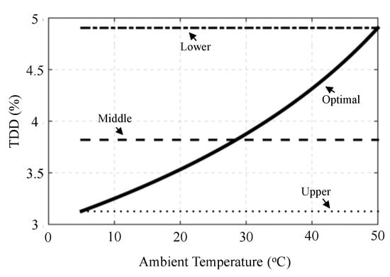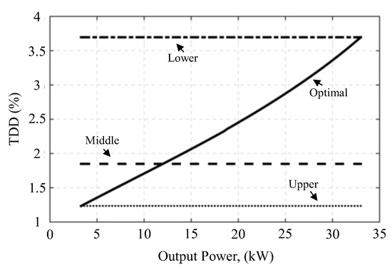 Alternatively, as the load increases, the TDD resulted from the utilization of the proposed algorithm (Figure 6) will start from its minimum value, which is achieved by selecting the highest switching frequency and then increasing linearly to reach the highest TDD at full loading condition. This shows that the TDD under the OASF algorithm follows the regulation at all loading conditions.