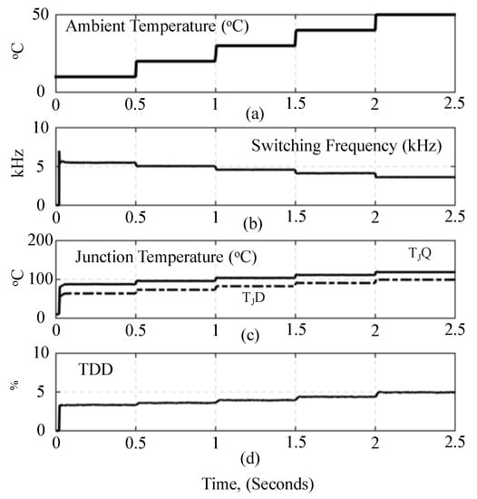 To study the impact of , which did not attract a lot of attention in the literature, the load is kept constant at the rated value and unity power factor, while the ambient temperature varies from 5 to 50 with 10 degrees-step at each 0.5 s, as shown in Figure 7a. This brief time is selected to be relatively small with respect to the practical rate of change to test the effectiveness of the proposed work as an online algorithm and to summarize the results in smaller figures. The switching frequency decreases as the temperature increases (Figure 7b) to ensure the optimal trade-off between switching losses and TDD (Figure 7d) while keeping the junction temperature within the operational range as indicated in Figure 7c. Moreover, the switching frequency linearly decreases as the ambient temperature increases, as shown in Figure 8a. The temperature profiles shown in (Figure 8b) and (Figure 7c) have smaller range of variation than the other fixed frequencies. At low temperatures, the junction temperatures when OASF algorithm is adopted are close to the junction temperatures obtained from the upper limit of the switching frequency and end with the lower limit of the switching frequency at high ambient temperature.