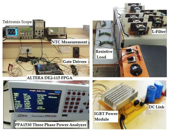 Figure 10 shows the experimental setup that is used to verify the proposed work. As the load varies at and unity power factor varies from 10% to 100% of the rated power, will decrease exponentially as in Figure 11a. A comparison with three fixed switching frequencies (10 kHz, 20 kHz, and 14.434 kHz) is carried out as shown in Figure 11b,c, in which the estimated junction temperatures and the experimental TDD increase as the load increases. Moreover, since the load is resistive, the TDD will be fixed with fixed switching frequencies, while with OASF algorithm, the switching frequency will decrease as the load increases. Hence, the TDD will increase. From Figure 11a, the full-load optimal is higher than 14.434 kHz (18.9 kHz); this is because of the change in the ambient temperature and the load power factor that relaxes the constraints on the optimal .
