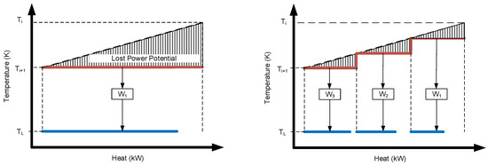 While the above process integration approaches are very well developed for targeting of process energy recovery and co-generation in utility systems, i.e., within a processing facility or a site, simple targeting approaches do not exist to quickly quantify the thermodynamic limits for power generation from a set of hot streams. The situation that excess heat is ejected beyond the boundaries of an industrial facility or site, e.g., into air or cooling water, is often encountered in macroscopic energy systems analysis. This excess heat is typically ejected from multiple hot streams. Instead of heat being ejected, this heat can be used to generate power. Our proposed approach aims to quickly answer the following question: How much power could theoretically be generated from the set of hot streams?