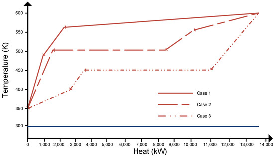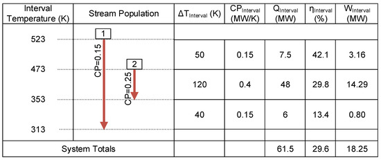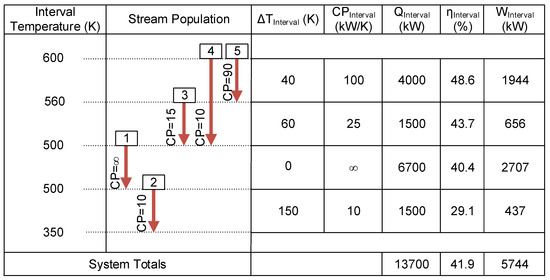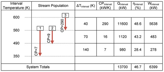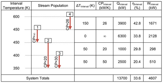 The problem table for each case was developed using the procedure outlined in the previous section. The problem table for Case 1 is shown in Figure 6. As can be seen from the data and composite curve for Case 1 (Table 1 and Figure 5), there are three changes in the streams that comprise the composite, resulting in three temperature intervals. All temperature intervals are non-isothermal and the heat removed from the composites is determined from Equation (2) for all three intervals. For instance, in the second interval, the combined heat capacity flow rate of the composite segment comprised by streams 1 and 2 is 16 kW/K and the interval ranges from 560 K to 490 K, i.e., has an interval temperature difference of 70 K. This results in a combined heat removal from the hot streams in the interval to be 1120 kW. Next, the interval efficiency for the non-isothermal interval is determined from Equation (8) using the interval temperatures: