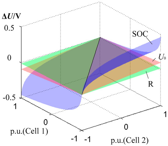 Different cells have different SOCs. The open circuit voltages and internal resistances may also be different if the cells are aged. In this paper, a Li-ion battery is applied and the capacity is 20 Ah. According to the parameter identification of a new cell, U0 is 3.44 V, R is 3 mΩ, and K is 0.1. Figure 2 shows the influence of the parameters U0, R, and SOC on U. The x-axis and y-axis are the standard unitary values of Cell 1 and Cell 2, respectively. The z-axis is the voltage difference ΔU. ic is 0.1 C (discharge-rate), which is 2A. The standard unitary values of the parameters are listed in Table 1.