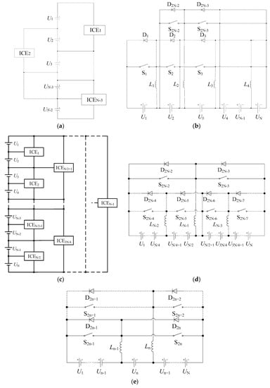 Figure 3 shows the equalisation structure of the cell-to-cell scheme. Figure 3a is the series-based battery equalisation system, where the equalisation speed is low. Figure 3b is the layer-based battery equalisation system. The number of the ICEs is the same in the two systems. There are N cells connected in series. The number of the ICEs is N − 1. The ICEs include N − 1 inductors and 2N − 2 switches. The equalisation speed of the layer-based system is higher. However, the number of the ICEs should be a power of 2.