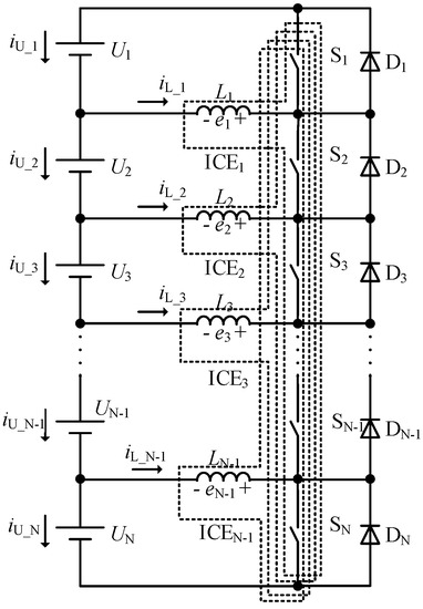 Figure 5 shows the simplified cell-to-pack topology, where U1–UN are the voltages of the cells, L1–LN−1 are the energy storage inductors, S1–SN are the power switches, and D1–DN are the anti-parallel diodes of S1–SN. These diodes can provide a continuous flow path of the inductor current. The principle of the topology is similar to that of the inductor symmetrically distributed equalisation topology. However, the number of inductors here is smaller and the freewheeling diodes can be replaced by the body diodes of the MOSFETs. Thus, external diodes will no longer be needed.
