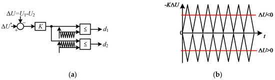 The output of the gain controller is −KΔU. Two different triangle carriers are compared in Figure 6b. The triangle carrier of S1 is the negative inverted triangle. The triangle carrier of S2 is the positive regular triangle. When the voltage U1 is higher than U2, −KΔU is less than zero. This triangle carrier does not intersect with the positive regular triangle, and S2 is off. S1 is controlled by Pulse Width Modulation (PWM). The more significant the difference of U1 and U2 is, the lower −KΔU is. In that case, the duty cycle of d1 increases, and U1 discharges quickly. Similarly, when U1 is lower than U2, the discharging process of U2 is managed by the closed-loop controller.
