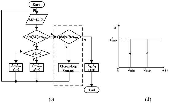 Figure 6c shows the control flowchart. If the voltage difference is higher than the upper limit εmax, then the corresponding switch works with the maximum duty cycle. If the voltage difference is higher than the lower limit εmin, then both of the two switches turn off.