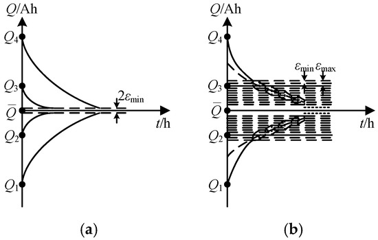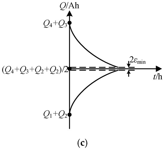 In the series-based equalisation scheme, energy can only be transferred cell by cell. If a cell is charged by one ICE and discharged by an adjacent ICE, the capacity will not change; however, the loss of the two ICEs cannot be avoided. Thus, the efficiency of the series-based equalisation scheme is low. Additionally, the equalisation time would be extended by the charging threshold εmin and the discharging threshold εmax. In Figure 8b, Cell 4 releases energy to Cell 3 and Cell 3 releases energy to Cell 2 in the beginning. Then Q3 does not change. If the difference between Q4 and (Q4 + Q3)/2 reduces to εmin, the ICE of Cell 4 and Cell 3 will stop working. The ICE of Cell 3 and Cell 2 continues working and Q3 reduces. If the difference between Q4 and (Q4 + Q3)/2 increases to εmax, the ICE of Cell 4 and Cell 3 starts to work again. This process would repeat multiple times, which results in a low equalisation speed. The additional time can be expressed as: