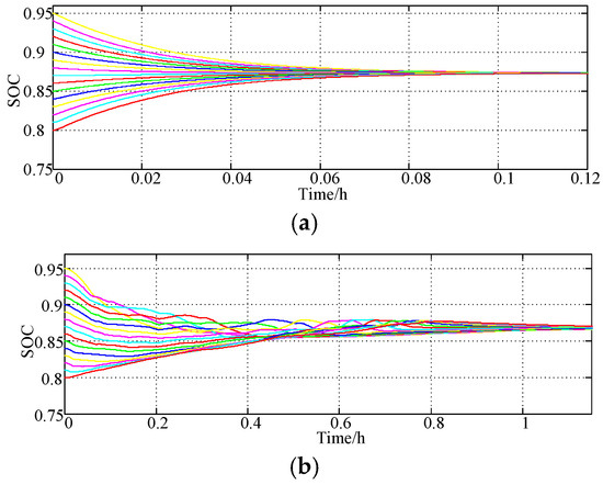 Figure 9 shows the SOC of the cells with different equalisation schemes. The initial SOCs of these cells are different to each other. After the implementation of an equalisation scheme, the SOCs of these cells tend to be the same. The equalisation speeds of the simplified equalisation scheme and the layer-based equalisation scheme are high. The final SOCs of the three schemes are 0.868, 0.860, and 0.872, respectively. The equalisation efficiency of the layer-based equalisation scheme is the highest.