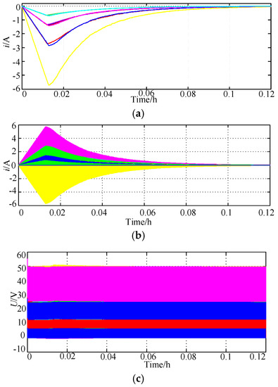 Figure 10 and Figure 11 show the key waveforms of the layer-based equalisation scheme and the simplified equalisation scheme. The switching frequency is 10 kHz. Figure 10a and Figure 11a show the current of the inductors decreases with time. It can be seen that the greater the distribution between initial SOC and the final equilibrium SOC is, the larger the corresponding balanced inductor current is. In Figure 11a, the inductor current in the simplified equalisation scheme drops to zero for a short period of time, indicating that it can achieve fast equalization. Figure 10b and Figure 11b show the current of the switches. The changes of the current are similar to that of the SOCs. Figure 10c and Figure 11c show the voltage of the switches. In Figure 11c, the maximum voltage of the cells is the sum of the cell voltages, and it is higher than the switch voltage of the layer-based equalisation scheme. In the layer-based equalisation scheme, the average of the voltage stress of the switch is lower than that of the simplified equalisation scheme.