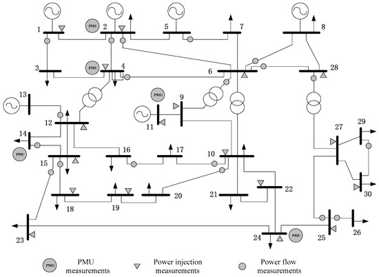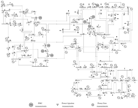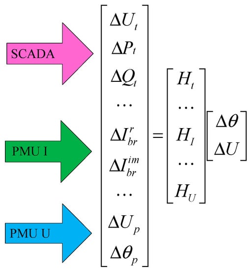 In power state estimation methods, the most commonly used measurements are line power flow, bus power injection and voltage magnitude measurements. In some cases, especially for state estimation of distribution buses, the line current magnitude measurements may be taken into consideration as well. Where PMUs exist, there will be two new types of measurements utilized by power system state estimation methods. One is voltage phasor measurements, which include voltage magnitudes and angles of the system bus, and the other is current phasor measurements, which include current magnitudes and angles of the transmission lines or transformers [34]. All types of measurements can be expressed in terms of the system state using Equation (1):
