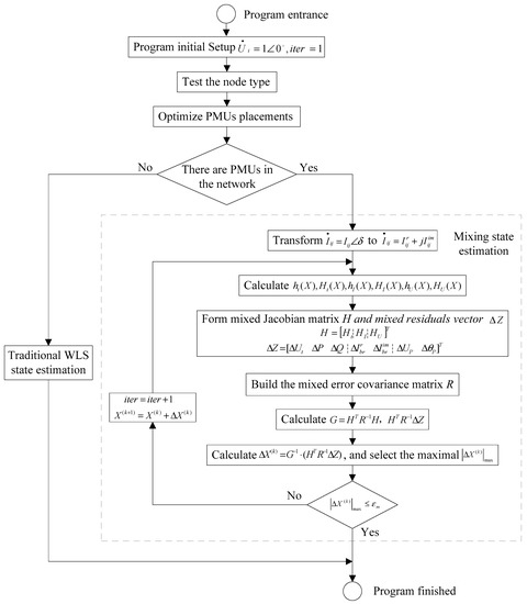 Based on the above analysis, the proposed mixed state estimation involves the iterative solution of the normal equations given by Equation (7). As shown in Figure 7, the iterative program flow can be described as following. In the implementation, the initial value of state variables including voltage magnitude and voltage phase angle, are respectively set to 1 and 0. Firstly, PMUs placements in the node system are optimized, and if there is not any PMUs in the network, the traditional WLS state estimation will be utilized. Otherwise, building the mixed Jacobian matrix H according to Equation (21), and then the maximal can be obtained by Equation (7). After a few calculations of iteration, the accuracy of current prediction becomes much better.
