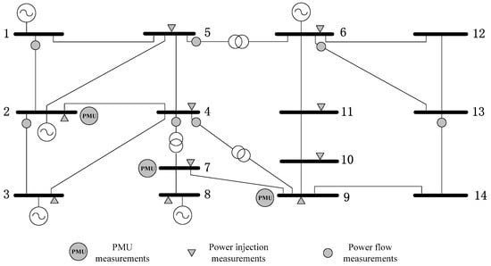 In the IEEE14 bus test system, the parameter configuration includes traditional measurements and PMU measurements. Figure 8 is the measurement configuration diagram of the IEEE 14 bus system [38]. The PMU is installed on buses 2, 7 and 9. In addition, traditional measurements include, the power flows in 1–2, 2–3, 4–7, 4–9, 5–6, 6–13 and 13–14, power injections in buses 2–11 and the voltage amplitude in bus 1. Four methods based on Figure 8 are designed to complete the state estimation, and simulation is carried out by MATLAB. The results are shown in Table 1 and Table 2. It should be noted that the proposed method is a fixed reference angle method, but in the calculation results, in order to intuitively reflect all the state of the entire system, the phase angles of all the buses are listed in this paper.