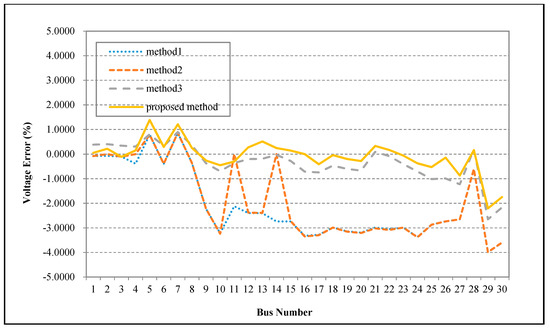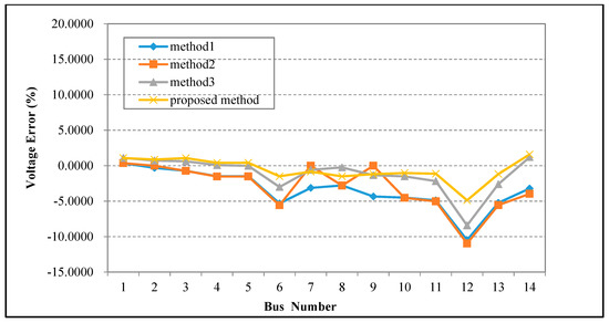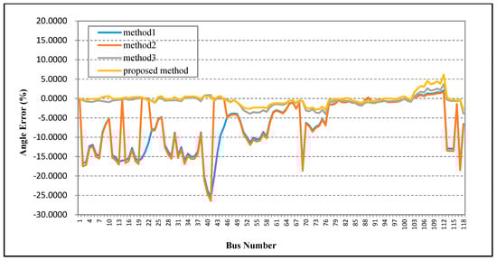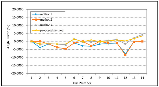 Figure 9 and Figure 10 are the result of percentage bus voltage amplitude and angle estimation errors using the data from Table 1 and Table 2. As can be seen from Table 3, the maximum percentage voltage error of the proposed method is 4.8849%, which represents a great improvement when compared with the three other methods. On the whole, we can see that Method 1 has the worst state estimation effect and the proposed method has the best estimation effect. It also should be pointed out the elapsed time of the proposed method shows no lessening, but we can accept it. This shows that when adding PMU data to conventional SCADA measurement inputs, the state estimator will raise its redundancy and improve its accuracy. Especially, the proposed mixed state estimation has more marked improvement.