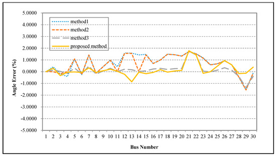 In the IEEE 30 bus test system, the PMU is installed at buses 2, 4, 11, 14, 24, as shown in Figure 13. All the simulation conditions are same with that of IEEE 14 bus system. The percentage of voltage amplitude and angle estimate error is plotted in Figure 14 and Figure 15. It can be observed from Figure 14 and Figure 15 that the overall performance of estimator with proposed method is better when compared with traditional estimator with method 1, 2, or 3. Other results are shown in Table 6.