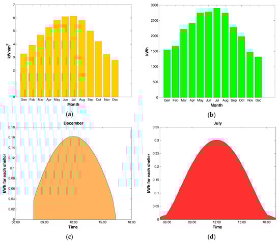 Considering the efficiency of the PV panels (Table 1), a power electronic converter global efficiency of 0.96, and the total surface of the shelters, it is possible to compute the mean value of energy (Figure 2b) generated by the considered PV power plant.