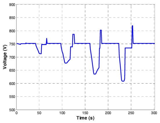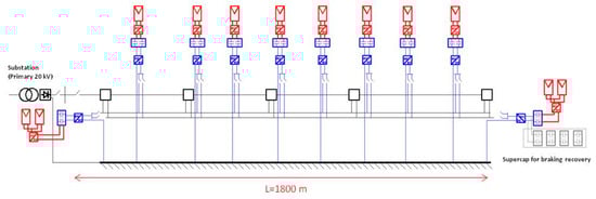 The electric scheme of the railway power system with the PV modules and SCs is shown in Figure 3. The railway power system is fed by a transformer with a primary voltage of 20 kV. The secondary side includes a bridge rectifier that outputs a voltage of 750 V. During its performance, the voltage in the different nodes of the net can vary in the range of 600–900 V. The output of the bridge rectifier is linked to the catenary of the power system. Table 2 reports some data of the railway power system [].