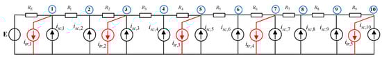 The output of the transformer is considered constant, and both the train and storage system units are considered to be current generators. RE is the resistance between the substation and the first node of the net, and Rj (j = 1, …, 9) are the line resistances between the different nodes. The stops are positioned along the track at nodes 1, 3, 5, 7, and 10. The mathematical model can be used for the following systems: