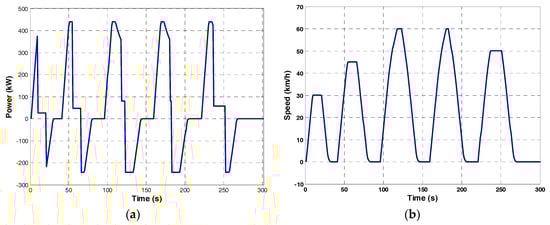 The optimization procedure is applied to the considered railway track, and the mechanical power and speed profile of a train traveling on the railway are respectively represented in Figure 6a,b. As can be noted, the profiles are typical of light railway power and speed profiles, with numerous accelerations and stops; this also shows that the current absorption presents numerous peaks, which can influence the behavior of the power electronic converter installed in the power system. The power stored in the SCs is supplied during the acceleration phases in order to reduce the total power absorbed by the substation. The optimization procedure was implemented considering SCs with the features reported in Table 3.
