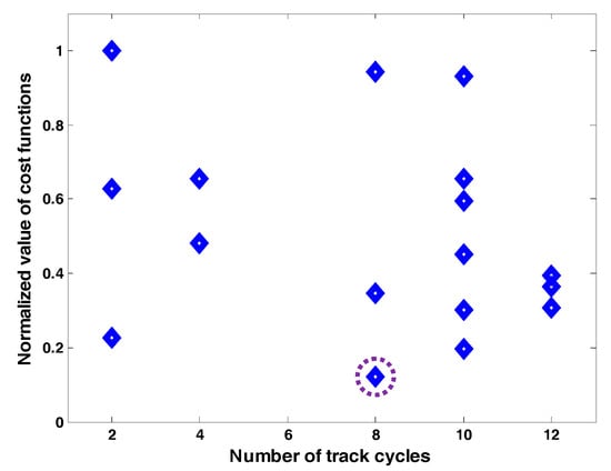 In (3), c1, c2, and c3 are weight parameters in Euro/kWh related to the cost of the SCs (ΔE is the energy stored in a single SC unit), the cost of the energy losses (Eloss), and the cost of the energy generated by the PV cells (Epv,p) and exchanged to the power system. The optimization procedure takes into account the solution of a complete track section for the train with all the stops, along with the calculation and evaluation of the cost functions for each combination obtained by the procedure (Figure 5).