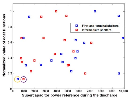 The random optimization procedure was carried out with 17 iterations, fixing c1 = 30,000, c2 = 0.2, and c3 = 0.1. Figure 7a,b shows the parallel and series SCs that must be installed at the initial and terminal stops (blue) and in the intermediate shelters, while Figure 8 shows the normalized cost function with various interval recharge times for the SCs, and Figure 9 shows the distribution of the cost function values as a function of the discharge power.