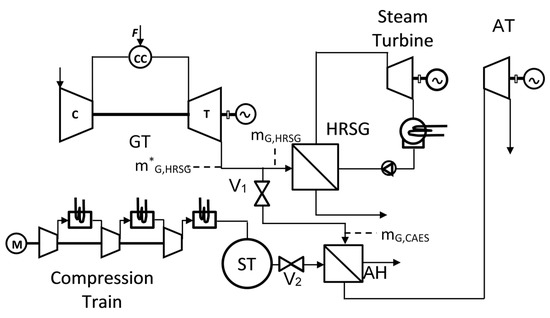 The plant reference layout is given in Figure 1. During the charging phase, a certain amount of electric power is absorbed from the grid to drive an electric motor M connected to a multi-stage intercooled/aftercooled compressor. As the charging phase takes place, both valves V1 and V2 are closed. Therefore, the compressed air is stored into the reservoir while all the GT exhaust gas flow
