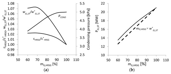 (a) HRSG effectiveness, electricity production per kilogram of gas and condensing pressure by varying the mass of gas entering the HRSG; (b) GSCC steam section power output.