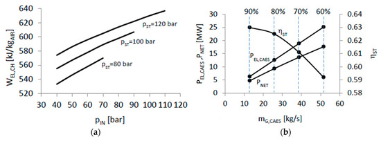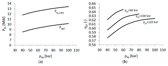 The power delivered by the AT does not depend on . Figure 4a shows both the power output actually produced by the AT and the CAES net power output as a function of . It can be observed that by increasing from 40 to 100 bar, shows an increase from 8.5 to some 10 MW.