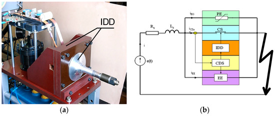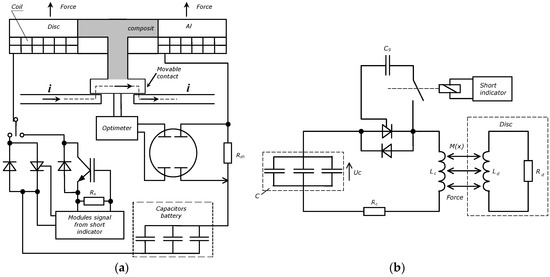 In the solution presented in this article, an electrodynamic propulsion–actuator is realized as the inductive dynamic drive (IDD). The IDD (Figures 1 and 3) is an integral part of a current limiting interrupting device (CLID) (Figure 1a,b), in which this actuator works synchronously with semiconductor elements [5,6].