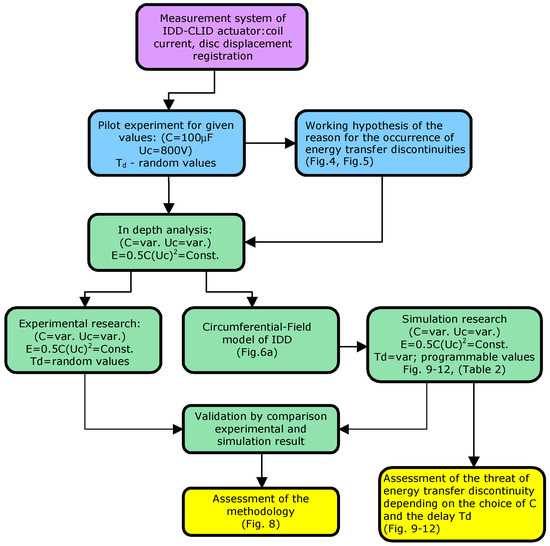In this context, a basic problem to solve is to identify the reasons and determine the conditions of occurrence of the hazardous operation of an electrodynamic propulsion–actuator, as well as to investigate the consequences of these phenomena and mitigation measures. A novelty of this paper concerns the carrying out of the experiment and simulation research, resulting in reasons explaining the incorrect operation of the hybrid switch drive, and elaboration of the authors’ new field–circumferential model of rectilinear propulsion, enabling the analysis of the electrodynamic actuator operation under discontinuous energy transfer to the drive coil. This analysis is related to and focused on the examination of a working hypothesis: in the real ultra-rapid drives, a random, stochastic disturbing signal can appear in a trigger circuit and cause discontinuities in the energy transfer to the drive coil. For a better understanding of the contents of this paper, a flow-chart of the investigation carried out is shown in Figure 2, in order to effectively demonstrate the proposed experimental and simulation research.