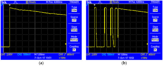 The description of the measuring system (Figure 3a), allowing for the registration of the coil current and the displacement of the drive (IDD) using the optical sensor (optimeter) was presented in detail in [7,8]. The power supply circuit of the coil is closed by controlled valve (transistor or thyristor with diode) so that one can conclude that the release of this valve occurs almost immediately after the detection of a short circuit. The gate circuit in the tested drive model can generate a continuous signal flowing in a short time of the whole process (less than a few milliseconds). Hence, it can be easily implemented as a (Resistive-Capacitive) RC circuit for discharging a small capacitor (Figure 3b). On the other hand, in a laboratory environment, a contactor is often used to initiate the discharge of this gate circuit. As a result of many tests (pilot experimental research) carried out in the measurement system (Figure 3), it turned out that the correct gate signal was obtained with a similarly random frequency (with similar probability distribution), as the disrupted signal (Figure 4). The obvious explanation for this is the appearance of the contact bounce of the contactor. Such a disturbed gate circuit signal is also the cause of discontinuous energy transfer from the capacitor bank to the coil (red waveform Figure 5a). At the same time, it should be emphasized that in industrial conditions, especially marine (e.g., stormy) conditions, such a disturbance of the gate control signal of low power at the moment of short-circuiting impulse may also appear during the operation of the CLID system, with a contactor-less solution.