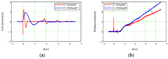 Registration of waveforms (at disturbed gate signal from Figure 4b) for C = 100 μF red line, C = 1000 μF blue line: (a) Coil currents (b) Displacements.