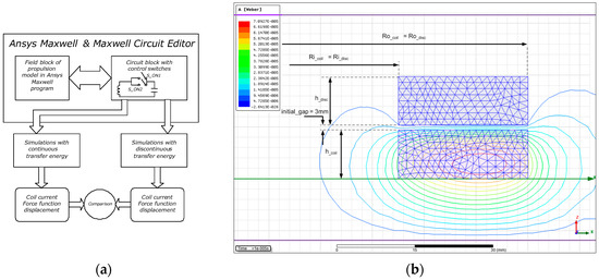 IDD model in the Ansys–Maxwell program: (a) Block scheme of the presented simulation examinations, (b) Flux density results in actuator model in Maxwell.