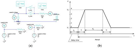 The external circuit was built in the Ansys_Maxwell_Circuit_Editor subprogram (Figure 7a). After opening this sub-program the coil symbol appears as the first object, which represents the coil of the main program Maxwell. By including further elements we can create an outer circumference of the coil, which is then exported to the main model in Maxwell program. This circuit employs two parallel switches that are controlled by a periodic signal (Figure 7b). The parameters of the signal, i.e., the rise time Tr and fall time Tf and the resistance value Roff and Ron of the switch in the off and on state in the block model (Figure 7a), one can set in such a way that operation of these connectors will be similar to the actual valve, such as a thyristor or a transistor. In the present study, very short times (1 × 10−15 s) were adopted for Tr and Tf, that is, it is assumed that both valves have similar, almost perfect dynamic properties. The on-time Td of the first connector is set to zero, while the second connector on-time was adjusted depending on with what delay we want the capacitor to return the next portion of energy.