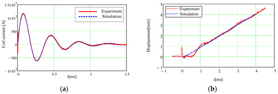 Figure 8a shows a comparison of the coil current waveform obtained in the field model with the course derived from the experiment with the bidirectional switch. Figure 8b shows a similar comparison of the disc displacements received from the circumferential–field model and the experiment. The results illustrated in Figure 8a,b are composed of two records, expressed by a solid line (experimental results) and a dash line (simulation results). The experiments and simulation research were carried out for the same capacity value C = 100 μF and for the remaining IDD parameters listed in Table 1.