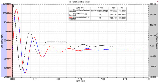 Continuous and discontinuous coil current and battery voltage (Uc = 800 V), (Case 1 from Table 2).