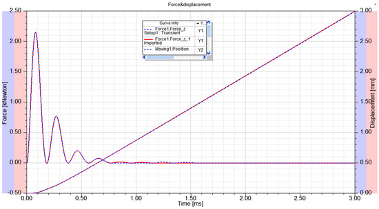 Preliminary simulation research for the validation of the IDD model has been compared with the experimental research for the propulsion parameters shown in Table 1 (Figure 8).This validation is based on the use of the field–circumferential model of rectilinear propulsion executed in the Maxwell program and the experiment made in the IDD measuring system presented in Section 2 (Figure 3a).