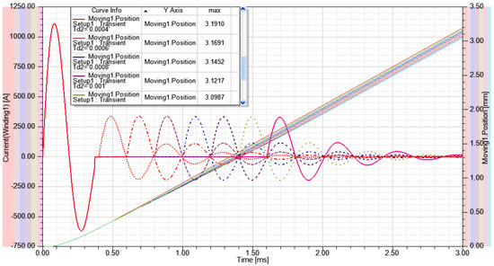 Given such a small amount of remaining energy in the capacitor, additional simulations determining the family of characteristics for the changing on-time (Td2) of the second switch were performed (Figure 11), (Case 2 from Table 2). Figure 11 shows a comparison of coil currents and corresponding displacements. This time one can see slight differences between the displacement waveforms, where the relative difference in the maximum range that the disc achieves after 3 ms between continuous and discontinuous cases does not exceed 4.5%.