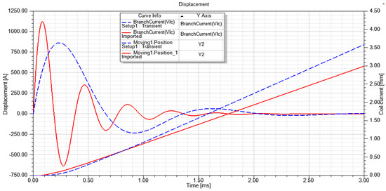 Coil current family and displacements corresponding to it (Uc = 800 V), (Case 2 from Table 2).