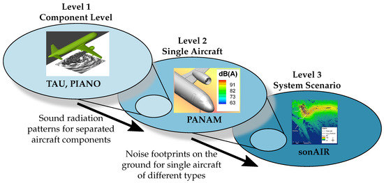 - Existing tools for noise prediction of different levels of complexity (i.e., component level, single aircraft level, system scenario level) can be coupled in order to aim for a resource efficient description of the noise exposure on the ground due to aircraft traffic.