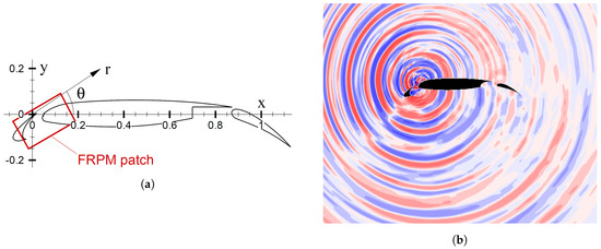 Typical computation setup for CAA simulation of slat noise and results of the pressure distribution. (a) Arrangement of fRPM (fast Random Particle Mesh Method) source patch (red box); (b) Snapshot of acoustic pressure (red=positive fluctuation, blue=negative fluctuation).