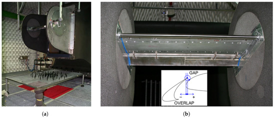 AWB (Acoustic Wind Tunnel Braunschweig) test arrangement for high lift airfoil F16 and detailed view of installed F16 (slat in front). (a) F16 airfoil in AWB (side view); (b) F16 airfoil pressure side in AWB (view from upstream); defintion of overlap and gap.