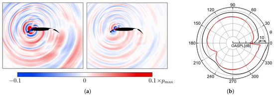 Noise reduction of VLCS at freestream flow speed = 60 m/s. (a) Snapshot of fluctuating sound pressure field radiating from F16 reference airfoil (left) and VLCS (right), -maximum value of pressure fluctuation magnitude in field; (b) Directivity of overall sound pressure level for F16 (black) vs. VLCS (red).