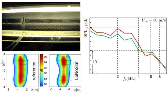 By elongating the slat chord considerably, the overlap of the slat trailing edge and the main wing front part is increased. This has two potentially positive consequences on the noise radiation. Assuming most sound to originate from the slat trailing edge, the positioning of this edge over the main airfoil will provoke acoustic shielding, so that less sound is radiated towards the ground. This is mostly an acoustic installation effect. Since slat sound is not only generated by eddies passing by the slat trailing edge, but to a considerable part by the acceleration of turbulent eddies in the mean flow as fluid gets pushed through the slat slot (see [33]), the VLCS reduces this acceleration. One reason is, that the acceleration from stagnation to maximum speed takes place over a longer path compared to the standard slat. As mentioned, one important feature of the VLCS is, that it features about the same aero-performance as the reference F16 airfoil. Figure 7 shows the noise reduction result of using this VLCS, as measured on an aircraft half model in the NWB acoustic wind tunnel of DNW (Deutsch-Niederländische Windkanäle) at DLR in Braunschweig, Germany. It should be noted that the noise reduction is on the order of 5–7 dB in a broadband sense. This already indicates that in this case it is reasonable to apply a constant modification of the standard slat noise model spectra used in the level two prediction code PANAM (see Section 3.2).