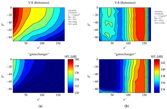 Emission diagrams of V-R and “gamechanger” for departure and approach configurations. (a) Emission diagrams—approach configuration. (b) Emission diagrams—departure configuration.