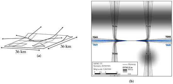 SANC-TE topography and scenario applied in the presented work. (a) SANC-TE topography and flight paths, ISO view, from [37]; (b) Input data of the SANC-TE scenario. Topography, runway, five departure tracks (solid black lines, TD0X), 2 approach tracks (solid blue lines, TA0X) and their sub-tracks (dotted / dashed) are depicted.