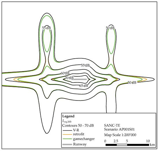 Finally, all three aircraft, i.e., V-R, “retrofit” and “gamechanger”, are simulated along tailored flight paths accounting for their individual flight performance [11]. Figure A1 and Figure A2 in the Appendix A show the simulated flight trajectories. It can be seen that all vehicles are forced to fly on nearly identical altitude profiles. Since no aerodynamic or weight penalties are accounted for, the V-R and “retrofit” yield identical flight trajectories. The “gamechanger” results in a slightly different flight path regarding thrust setting and airspeed due to different aerodynamics and weights compared to the reference vehicle. These approach and departure flight paths are then again translated into a corresponding sonAIR input format in order to enable the flight simulation. Finally, each vehicle can now directly be modelled in sonAIR according to its individual emission database and along its individual flight procedure. The three vehicles along their defined approach and departure flights can now be integrated into a larger airport scenario as simulated with sonAIR. Thus, the gap between level two and level three is closed. The scenario used within this work is described in the following section.
